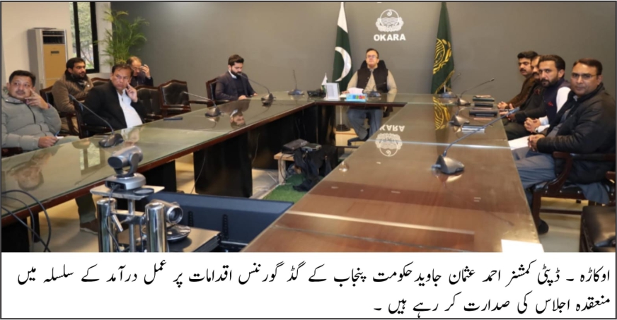 اوکاڑہ (باغی ٹی وی/نامہ نگار ملک ظفر)ڈپٹی کمشنر اوکاڑہ احمد عثمان جاوید کی زیر صدارت مفادِ عامہ کے پیش نظر حکومتِ پنجاب کے گڈ گورننس اقدامات پر مؤثر عملدرآمد کے سلسلے میں ایک اہم اجلاس منعقد ہوا۔ اجلاس میں ایڈیشنل ڈپٹی کمشنر ریونیو محمد شعجین وسطرو، ایڈیشنل ڈپٹی کمشنر فنانس اینڈ پلاننگ چوہدری عبدالجبار گجر، ایڈیشنل ڈپٹی کمشنر جنرل احمد سلیم چشتی، تینوں تحصیلوں کے اسسٹنٹ کمشنرز، اسسٹنٹ کمشنر ہیڈ کوارٹر نور محمد، ڈپٹی ڈائریکٹر ڈویلپمنٹ مرغوب حسین ڈوگر، ایس ڈی ای او پیرا وسیم جاوید، ایس این اے افضال حسین بلوچ سمیت دیگر متعلقہ افسران نے شرکت کی۔