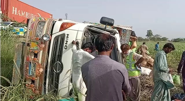 نواب شاہ: تحصیل قاضی احمد قومی شاہراہ پرٹرک الٹنے 10 افراد زخمی،لاکھوں کے مویشی ہلاک