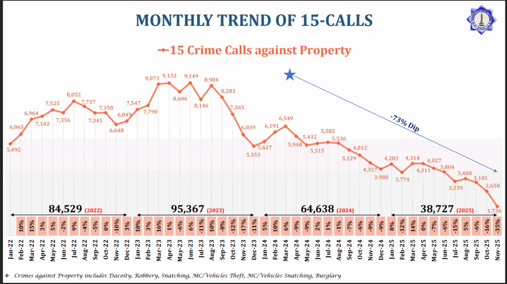 پنجاب کے صوبائی دارالحکومت لاہور میں اسٹریٹ کرائم اور جائیداد سے متعلق وارداتوں کے حوالے سے ایک اہم رپورٹ سامنے آئی ہے جس کے مطابق جنوری 2022 سے نومبر 2025 تک 15 ہیلپ لائن پر موصول ہونے والی "کرائم کالز اگینسٹ پراپرٹی” میں غیر معمولی کمی ریکارڈ کی گئی ہے۔