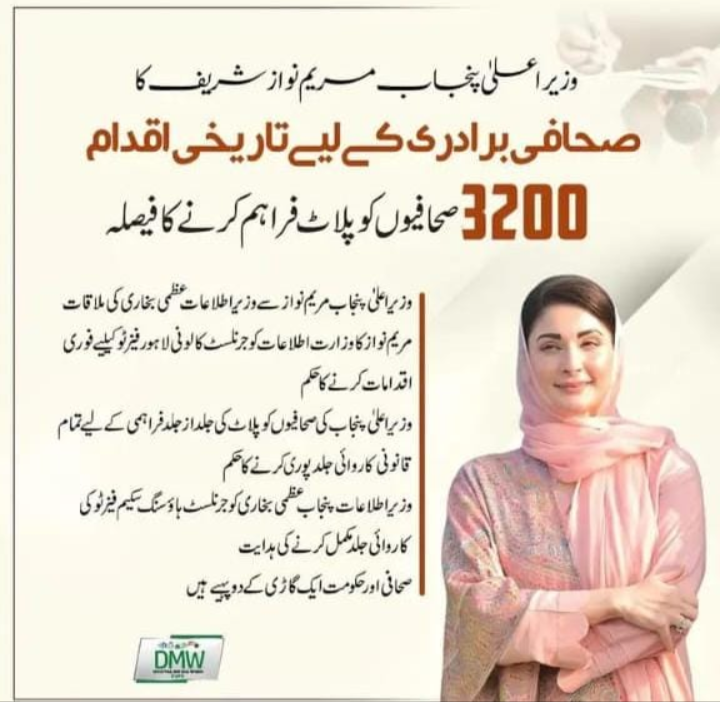 وزیر اعلی پنجاب مریم نواز کی جانب سے 3200 صحافیوں کو پلاٹس کی فراہمی کی یقین دہانی،قصور کی صحافی برادری کا میرٹ اور پارٹی بیس سے ہٹ کر منصفانہ تقسیم کا مطالبہ
