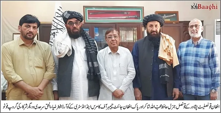 افغان قونصلیٹ پشاور کے قونصل جنرل حافظ محب اللہ شاکر کے درمیان پاک افغان باہمی تجارت اور ٹرانزٹ ٹریڈ میں درپیش مسائل کے دیر پا حل اور رکاوٹوں کو دور کرنے کے لئے باہمی مشترکہ کوششیں کرنے پر اتفاق رائے ہو ا ہے۔