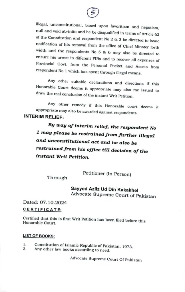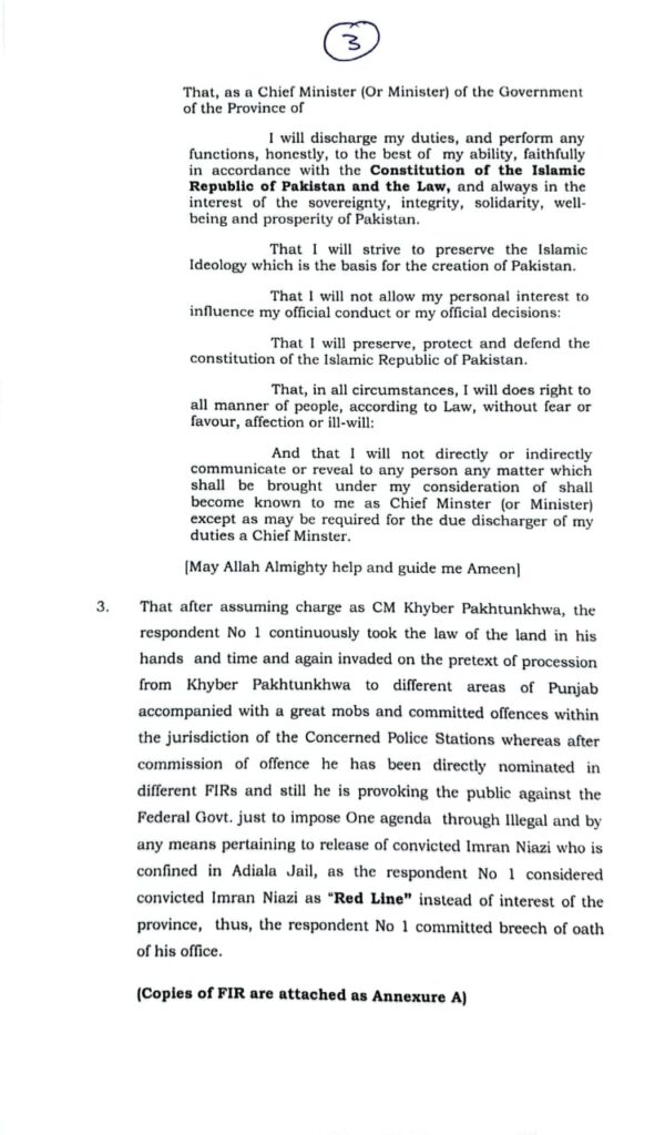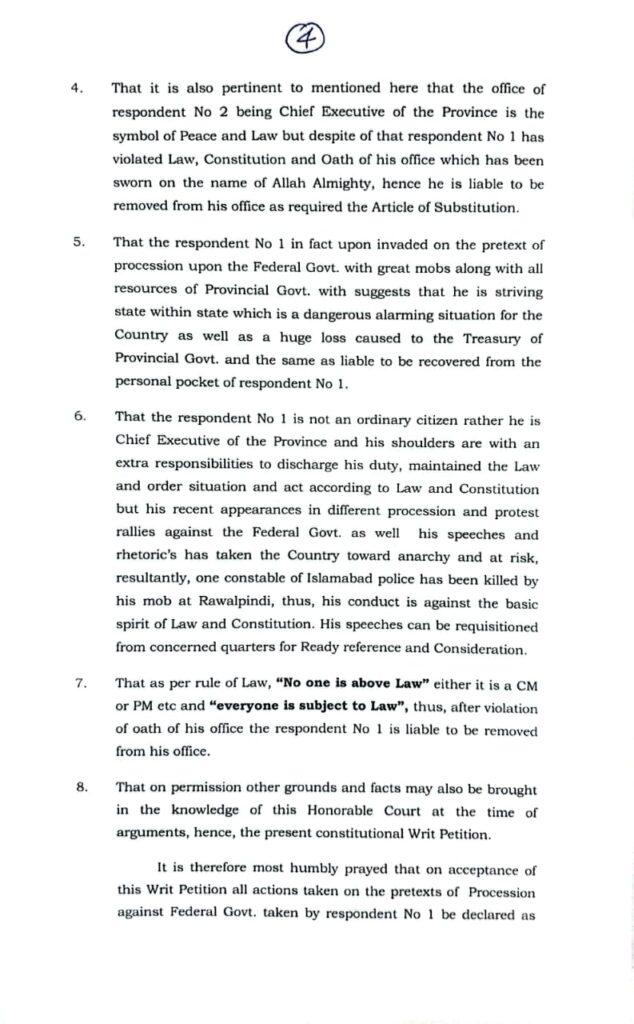 درخواست ایڈوکیٹ عزیز الدین کاکا خیل کی جانب سے پشاور ہائی کورٹ میں دائر کی گئی،درخواست میں مؤقف اختیار کیا گیا کہ وزیر اعلی علی امین گنڈا پور نے اپنے حلف کی خلاف ورزی کی، آرٹیکل 62 کے تحت نااہل کیا جائے، علی امین گنڈا پور نے جلسوں کے لیے سرکاری وسائل استعمال کیا ،وزیر اعلی کے منصب پر فائز سرکاری وسائل سیاسی مقاصد کے کے لیے استعمال نہیں کیے جا سکتےعلی امین گنڈا پور نے لشکر کے ساتھ وفاقی حکومت پر چڑھائی کی،جو تشویش ناک ہےدرخواست میں وزیر اعلی کو کام سے روکنے کے لیے حکم امتناع کی استدعا بھی کی گئی ہے، درخواست میں استدعا کی گئی ہے کہ وزیر اعلی کے ذاتی اکاؤنٹ سے سرکاری وسائل کے استعمال کی ریکوری کی جائے، گنڈاپور وفاق کیخلاف عوام کو اُکسا رہے ہیں، وہ ریاست کو ریاست کے ساتھ لڑوانا چاہتے ہیں، برطرفی کا حکم دیا جائے