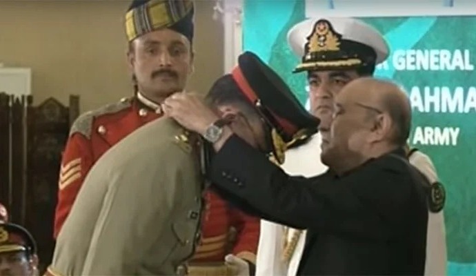 باغی ٹی وی: فوجی اعزازت دینے کی تقریب ایوان صدر میں منعقد ہوئی، آغاز پر قومی ترانے کی دھن پیش کی گئی، صدر مملکت نے ملکی دفاع میں نمایاں خدمات انجام دینے والوں کو فوجی اعزازت سےنوازا۔