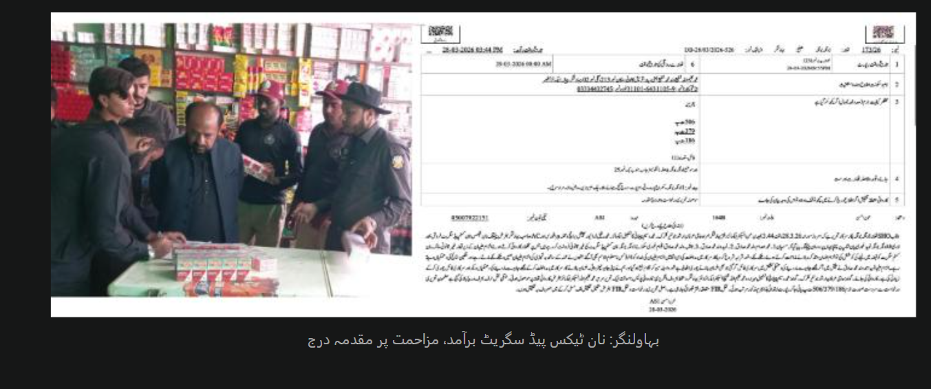 بہاولنگر ((بہاولنگر باغی ٹی وی محمد عرفان نامہ نگار )) اسپیشل برانچ کی نشاندہی پر اسسٹنٹ کمشنر کی سربراہی میں محکمہ ایکسائز نے لاری اڈا ڈونگہ بونگہ میں کامیاب کارروائی کرتے ہوئے نان ٹیکس پیڈ سگریٹ کی بڑی مقدار برآمد کر لی۔ حکام نے موقع پر موجود تمام غیر قانونی اسٹاک قبضے میں لے لیا۔