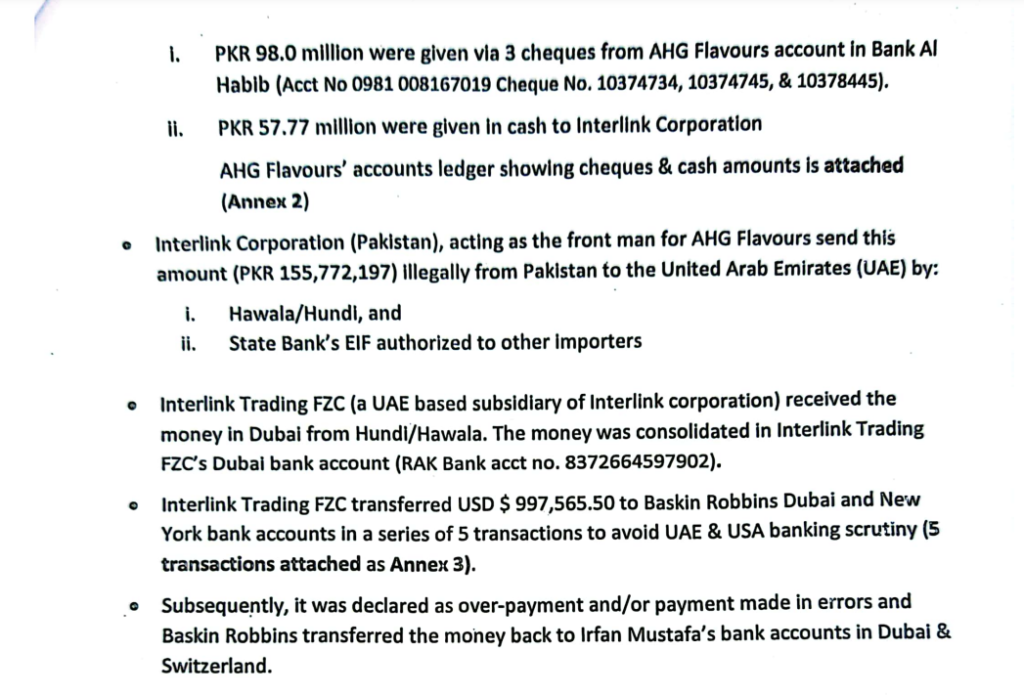 مقامی شہری عبدالقیوم حفیظ کی طرف سے امریکی آئس کریم فروخت کرنے والی کمپنی باسکن روبن کے بارے میں سینکڑوں صفحات پر مشتمل کاغذات اور درخواست ایف آئی اے لاہور کو دی گئی جس پر تحقیقات ابھی بھی جاری ہیں درخواست میں موقف اپنایا گیا ہے کہ کمپنی 2017 میں رجسٹرڈ ہونے کے بعد پاکستان میں کاروبار کر رہی ہے ،جبکہ پاکستان میں ٹیکس چوری کے علاوہ منی لانڈرنگ کے کاروبار میں بھی ملوث ہیں درخواست میں بتایا گیا ہے کہ امریکہ میں پاکستانی سفارت خانے کے ذریعے بھی تحقیقات کی درخواست کی گئی ہے جس پر وزارت داخلہ اور قانون نافذ کرنے والے ادارے بھی تحقیقات کر رہے ہیں درخواست میں بتایا گیا ہے کہ کمپنی دبئی کے ذریعے امریکہ میں 10 ملین ڈالر سے زائد رقم غیر قانونی طریقے سے منتقل کیے ہیں اور اس حوالے سے دستاویزات بھی ساتھ لگائی گئی ہیں ،آئس کریم فروخت کرنے والی کمپنی جو کہ پاکستان میں اے ایچ جی فلیورز پرائیویٹ لمٹڈ کے نام سے رجسٹرڈ ہے۔ نے باسکن روبن ایس کریم کے ذریعے منی لانڈرنگ اور حوالہ ہنڈی کا استعمال کیا ہے، کمپنی انٹر لنک ٹریڈنگ جو کہ دبئی میں ایک رجسٹرڈ کمپنی اس کو استعمال کرتے ہوئے انڈر انوائسنگ اور دیگر ٹیکس چوری کی وارداتیں کرتے ہوئے بھی قومی خزانے کو اربوں روپے کا نقصان پہنچایا ہے مزید بتایا گیا ہے کہ انٹرلینٹ کمپنی پاکستان سے منی لانڈرنگ کے کاروبار میں ملوث ہے اور یہ باسکن روبن پاکستان اور دبئی کی انتظامیہ کے ساتھ مل کر منی لانڈرنگ کی سہولت فراہم کرتی ہے .
