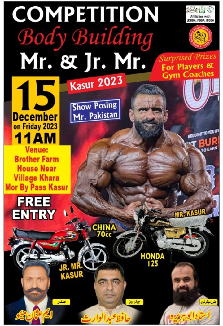 تفصیلات کے مطابق آج 15 دسمبر 2023 بروز جمعہ بوقت دن 11 بجے برادر لون فارم نزد کھارا گاؤں قصور بائی پاس میں قصور باڈی بلڈنگ کا سالانہ کمپیٹیشن ہو گا