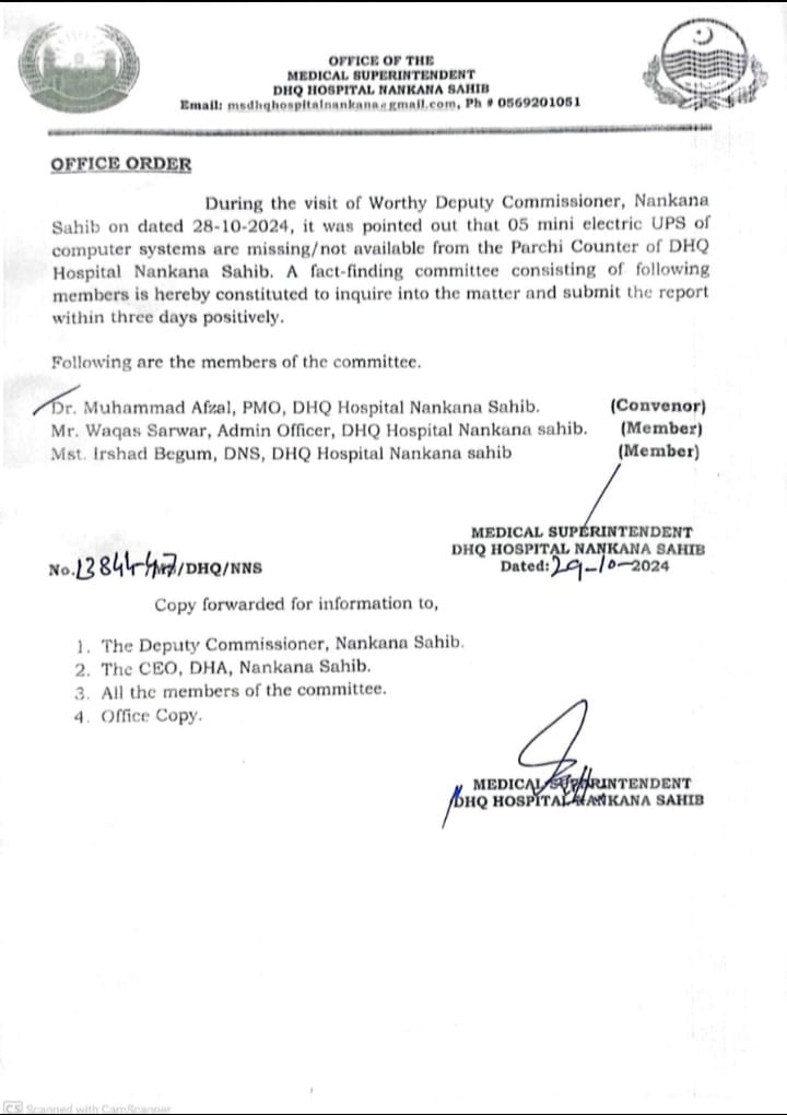 ننکانہ صاحب ،باغی ٹی وی(نامہ نگار احسان اللہ ایاز) ڈسٹرکٹ ہیڈ کوارٹر ہسپتال ننکانہ صاحب میں ایک ایسا تہلکہ خیز سکینڈل سامنے آیا ہے کہ جس نے انتظامیہ کی نااہلی اور مبینہ ملی بھگت کے تمام پردے چاک کر دیے ہیں۔ اطلاعات کے مطابق ہسپتال کے کاؤنٹر پرچی پر نصب کمپیوٹرز سے لاکھوں روپے مالیت کے پانچ قیمتی الیکٹرک یو پی ایس پراسرار طور پر غائب ہو گئے ہیں!