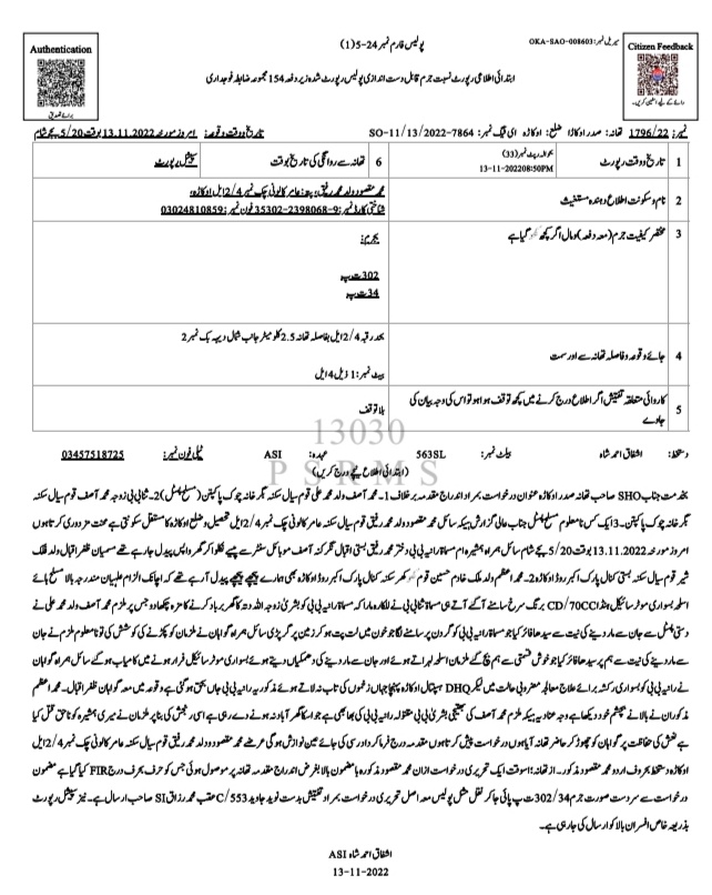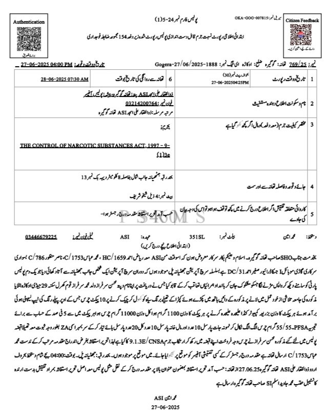 ایس ایچ او سعید احمد بھٹی اور انچارج انویسٹی گیشن عظمت علی نے انٹیلیجنس بیسڈ آپریشن کے دوران جھٹیانہ پل کے قریب چھاپہ مار کر ملزم کو گرفتار کیا۔ ملزم کے خلاف امتناعِ منشیات ایکٹ کے تحت مقدمہ درج کر لیا گیا ہے جبکہ تفتیش جاری ہے۔