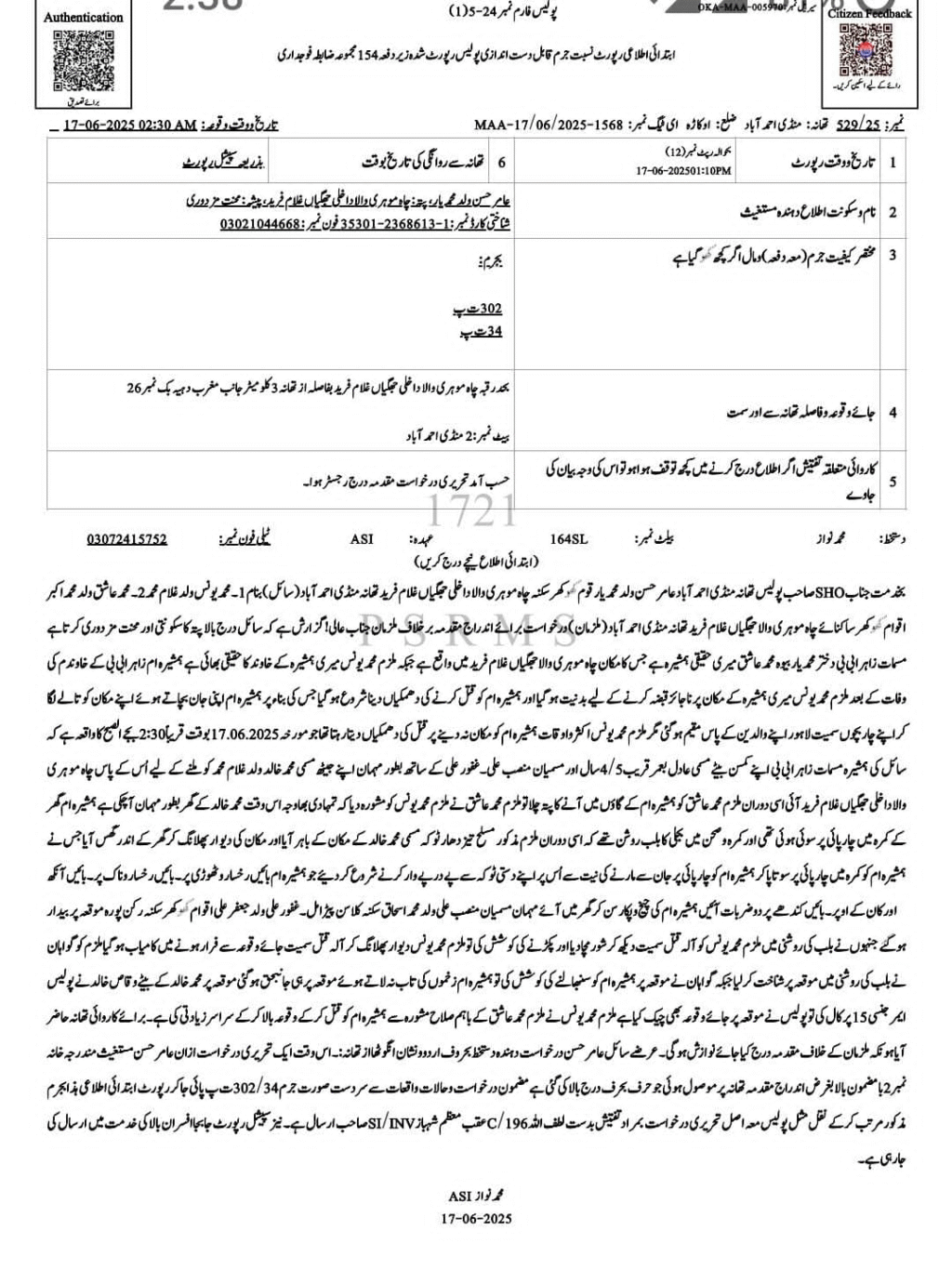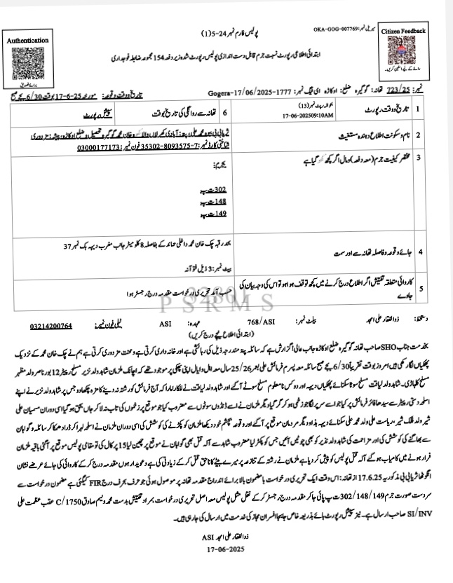 ڈی پی او کے نوٹس پر پولیس نے مقتول فرمائش کی والدہ کی درخواست پر شاہد اور اس کے ساتھیوں کے خلاف مقدمہ نمبر 723/25 درج کر لیا۔ دوسری جانب شاہد کی موت کے بعد اس کے ورثاء کی درخواست پر کراس ورژن بھی درج کر لیا گیا ہے۔