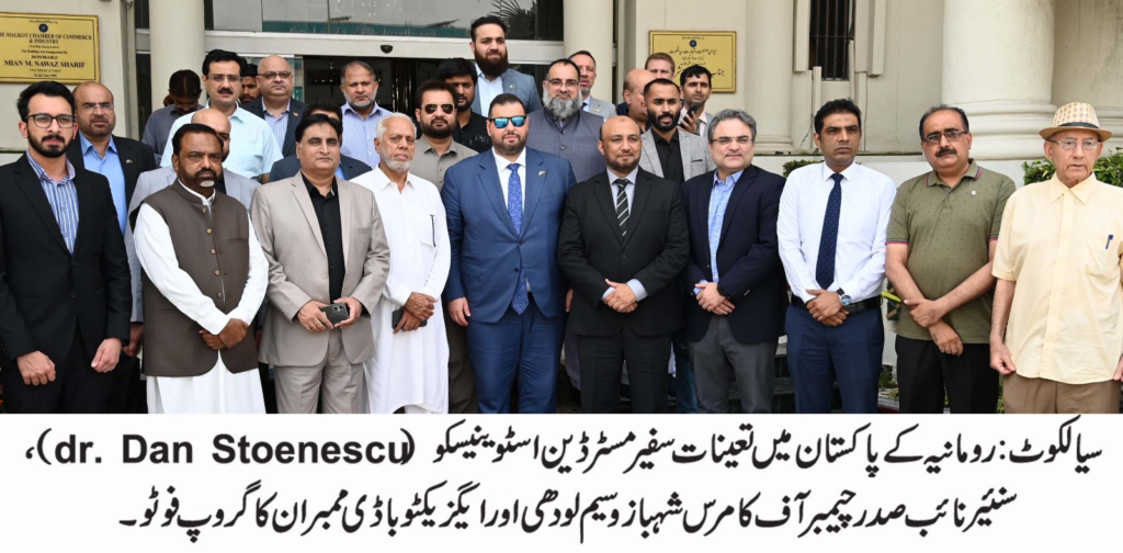 پاکستان میں تعینات رومانیہ کے سفیر ڈاکٹر ڈین اسٹوینسکو نے اپنی ٹیم کے ہمراہ سیالکوٹ چیمبر آف کامرس اینڈ انڈسٹری کا دورہ کیا۔ اس موقع پر چیمبر کے سینئر نائب صدر وسیم شہباز لودھی اور ایگزیکٹو باڈی ممبران نے معزز مہمانوں کا پرتپاک خیر مقدم کیا۔ اجلاس میں دو طرفہ تجارت، سرمایہ کاری اور باہمی دلچسپی کے دیگر شعبہ جات پر تفصیلی گفتگو کی گئی۔