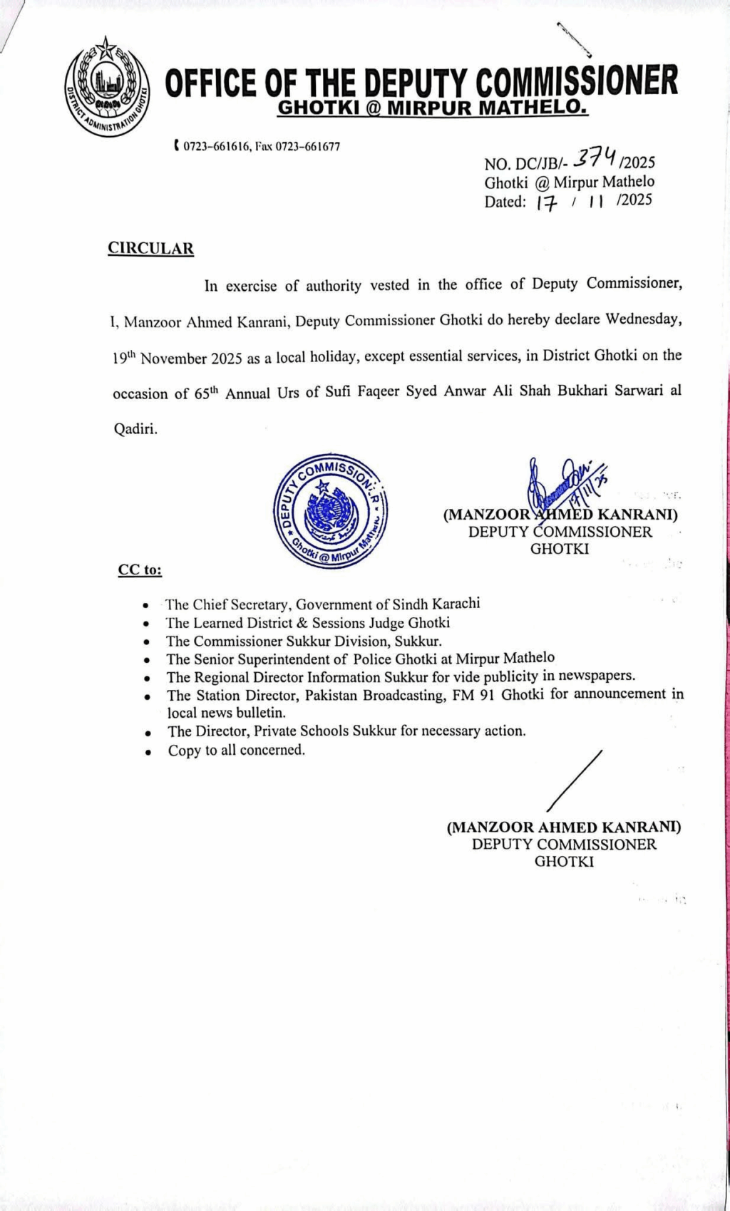 ڈپٹی کمشنر منظور کنرانی نے کہا کہ اگرچہ ضلع گھوٹکی کے بہت سے اساتذہ اپنی ذمہ داریاں ایمانداری سے ادا کر رہے ہیں، تاہم چند مسلسل غیر حاضر اساتذہ پورے نظام کو نقصان پہنچا رہے ہیں۔ انہوں نے اساتذہ پر زور دیا کہ وہ مثبت سوچ، جذبہ خدمت اور خلوص کے ساتھ اپنی ذمہ داریاں ادا کریں تاکہ علاقے میں تعلیم کا فروغ ممکن ہو سکے۔