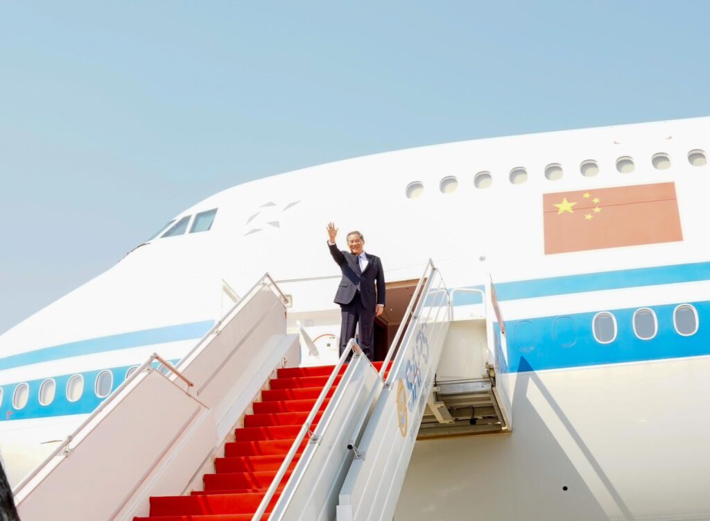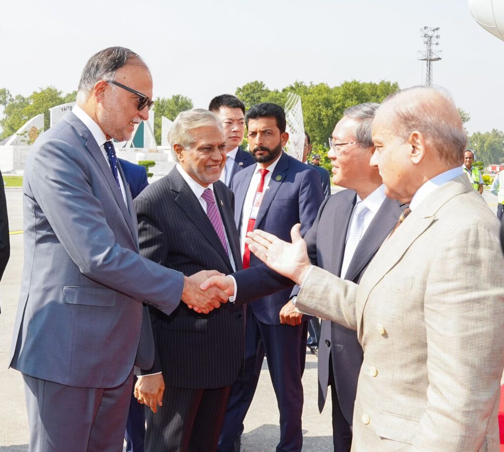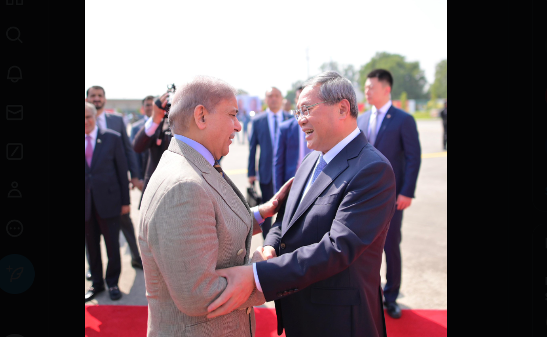 اسلام آباد میں نور خان ائربیس پر وزیراعظم شہباز شریف نے چینی وزیراعظم کا استقبال کیا،نائب وزیر اعظم اسحاق ڈار،وفاقی وزیر داخلہ محسن نقوی اور وزیر اطلاعات عطاء تارڑ بھی وزیر اعظم کے ہمراہ تھے،یہ دورہ کسی بھی چینی وزیر اعظم کا 11 برس بعد پاکستان کا پہلا دورہ ہے.چینی وزیراعظم طیارے سے باہر آئے تو انہوں نے ہاتھ ہلایا، جس کے بعد وزیراعظم شہباز شریف نے جواب دیا، چینی وزیراعظم کا ریڈ کارپٹ استقبال کیا گیا،، چینی وزیراعظم کو اسلام آباد پہنچنے پر ایئر پورٹ پر ہی 21 توپوں کی سلامی دی گئی، بعد ازں وزیراعظم شہباز شریف اور چینی وزیراعظم بات چیت کرتے ہوئے آگے بڑھے،بعد ازاں چینی وزیراعظم لی چیانگ وزیراعظم شہباز شریف کے ہمراہ گاڑی پر سوار ہوکر وزیراعظم شہباز شریف کے ہمراہ وزیراعظم ہاؤس کے لئے روانہ ہوئے