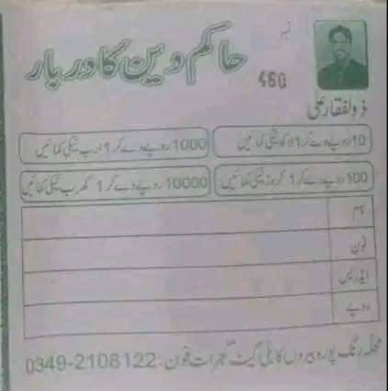 واقعہ پنجاب کے شہر گجرات کا ہے جہاں ایک شخص نے پمفلٹ چھپوائے اور کہا کہ نیکیاں چاہئے تو پیسے لاؤ اور نیکیاں لے جاؤ، پمفلٹ پر نیکیوں کی قیمت بھی لکھی تھی، پمفلٹ پر لکھا تھا کہ 10 روپے کی ایک لاکھ نیکیاں، 100 روپے کی ایک کروڑ، ایک ہزار کی ایک ارب اور 10 ہزار روپے کی ایک کھرب نیکیاں،پملفٹ پر حاکم دین کا دربار اوپر لکھا ہوا تھا،پتہ محلہ رنگ پورہ بیرون کابلی گیٹ درج کیا گیا تھا، رسید پر نام، فون نمبر اور ایڈریس کے خانے بھی بنائے گئے تھے،