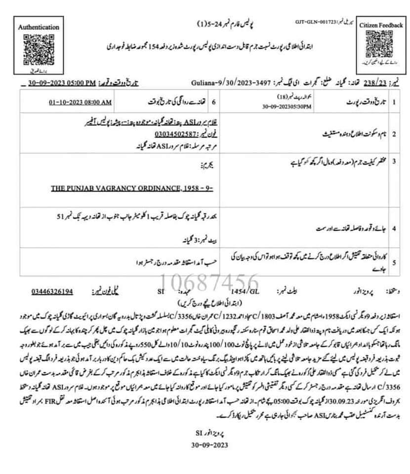 پولیس نے واقعہ کا مقدمہ درج کر لیا ہے،مقدمہ اے ایس آئی غلام سرور کی مدعیت میں درج کیا گیا ہے، درج مقدمہ میں کہا گیا ہے کہ گلیانہ چوک میں موجود ہوں کہ ایک شخص جس کابعد میں نام ذوالقفار سکنہ کابلی گیٹ گجرات سامنے آیا،چل پھر کر چندہ کا بہانہ بنا کر لوگوں سے بھیک مانگ رہا تھا،تلاشی کے دوران اسکے جیب سے کرنسی برآمد ہوئی اور جامہ تلاشی لی گئی تو اسکے بیگ سے رسید بک بھی برآمد ہوئی جس میں نیکیوں کی قیمت لکھی تھی،ملذم نے بھیک مانگ کر جرم کا ارتکاب کیا،جس کے خلاف مقدمہ درج کر لیا گیا ہے،