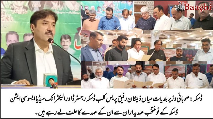 سیالکوٹ (باغی ٹی وی بیوروچیف شاہد ریاض) صوبائی وزیر بلدیات پنجاب میاں ذیشان رفیق نے پریس کلب (رجسٹرڈ) ڈسکہ اور الیکٹرانک میڈیا ایسوسی ایشن کے عہدیداران کی حلف برداری کی تقریب میں شرکت کی۔ اس موقع پر پریس کلب ڈسکہ کے چیئرمین شکیل اکرم بٹ، جنرل سیکرٹری رانا وسیم اشرف، ڈاکٹر افضال خان، پرویز عالم بٹ، عدنان ناصر مغل، غضنفر مغل، رانا محمد شبیر، اور الیکٹرانک میڈیا ایسوسی ایشن ڈسکہ کے صدر عمران شریف، جنرل سیکرٹری عثمان حیدر، مظفر چوہان، نوید شیخ، ملک چاند، اور سلیم عباس بخاری نے اپنے عہدے کا حلف لیا۔