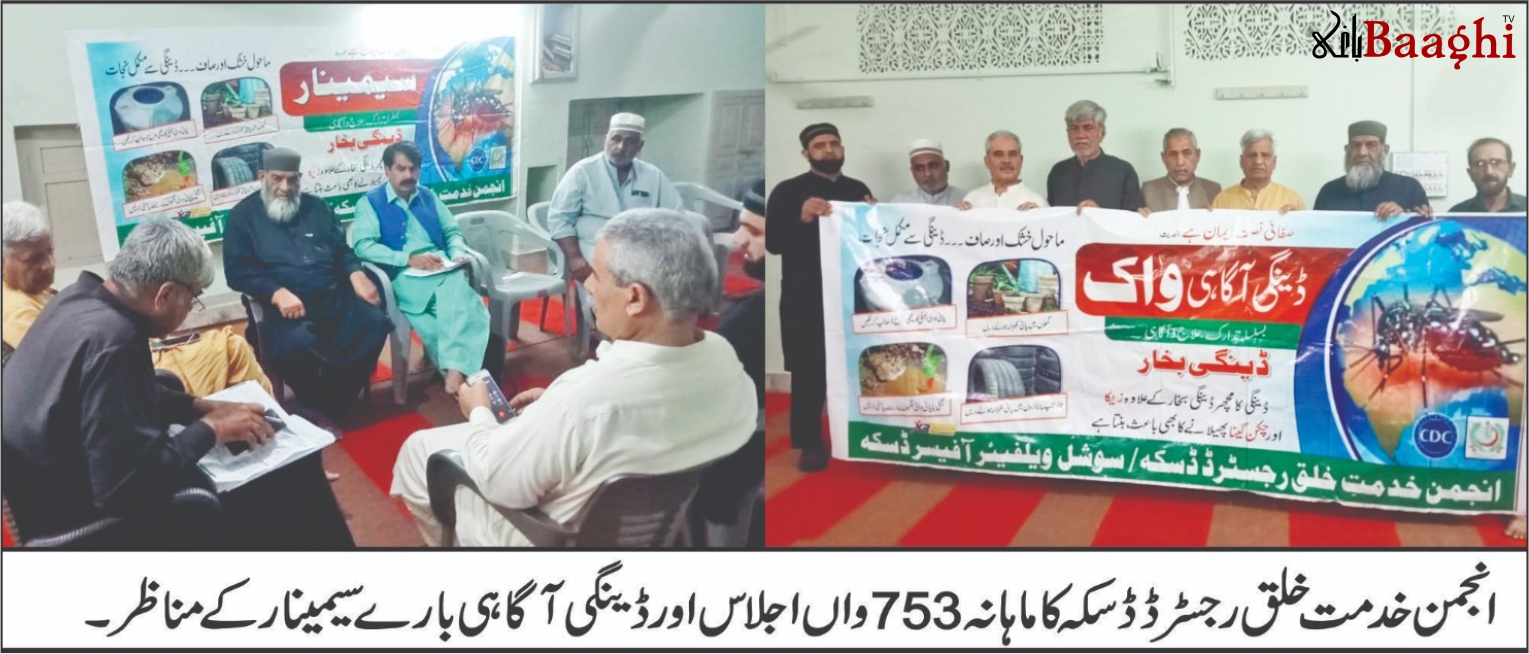 ڈسکہ,باغی ٹی وی(نامہ نگارعمران ملک) انجمن خدمت خلق رجسٹرڈ ڈسکہ کا 753واں ماہانہ اجلاس اور ڈینگی آگاہی سیمینار زیر صدارت صدر میاں سعید احمد صراف مدرسہ جامع عزیزیہ وڈالہ روڈ پر منعقد ہوا۔ اجلاس کا آغاز تلاوتِ قرآن پاک سے ہوا جس کی سعادت حافظ عبدالغفار نے حاصل کی جبکہ نعت رسول مقبول ﷺ انوار احمد سیال نے پیش کی۔