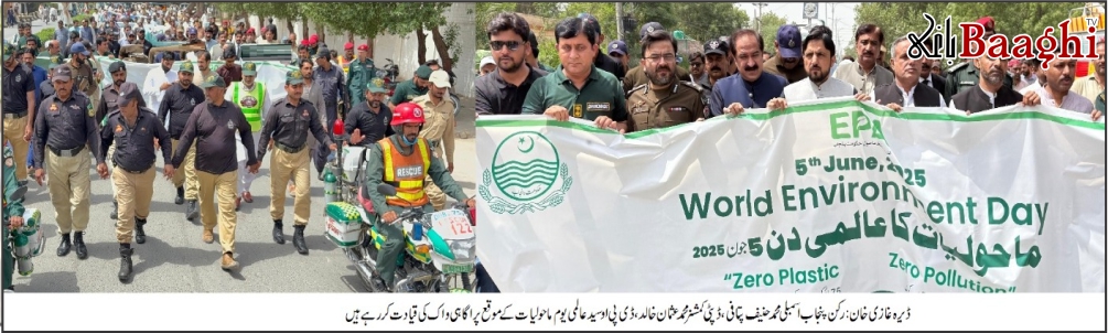 ڈیرہ غازی خان (باغی ٹی وی، نیوز رپورٹر شاہد خان) عالمی یوم ماحولیات کے موقع پر ڈیرہ غازی خان میں ایک بھرپور آگاہی واک کا انعقاد کیا گیا، جس کی قیادت رکن پنجاب اسمبلی محمد حنیف پتافی، ڈپٹی کمشنر محمد عثمان خالد اور ڈی پی او سید علی نے کی۔ واک میں شہریوں، دکانداروں، تاجر تنظیموں، وکلاء، سیاسی و سماجی رہنماؤں، سول سوسائٹی، اور مختلف محکموں کے افسران و ملازمین نے شرکت کی۔