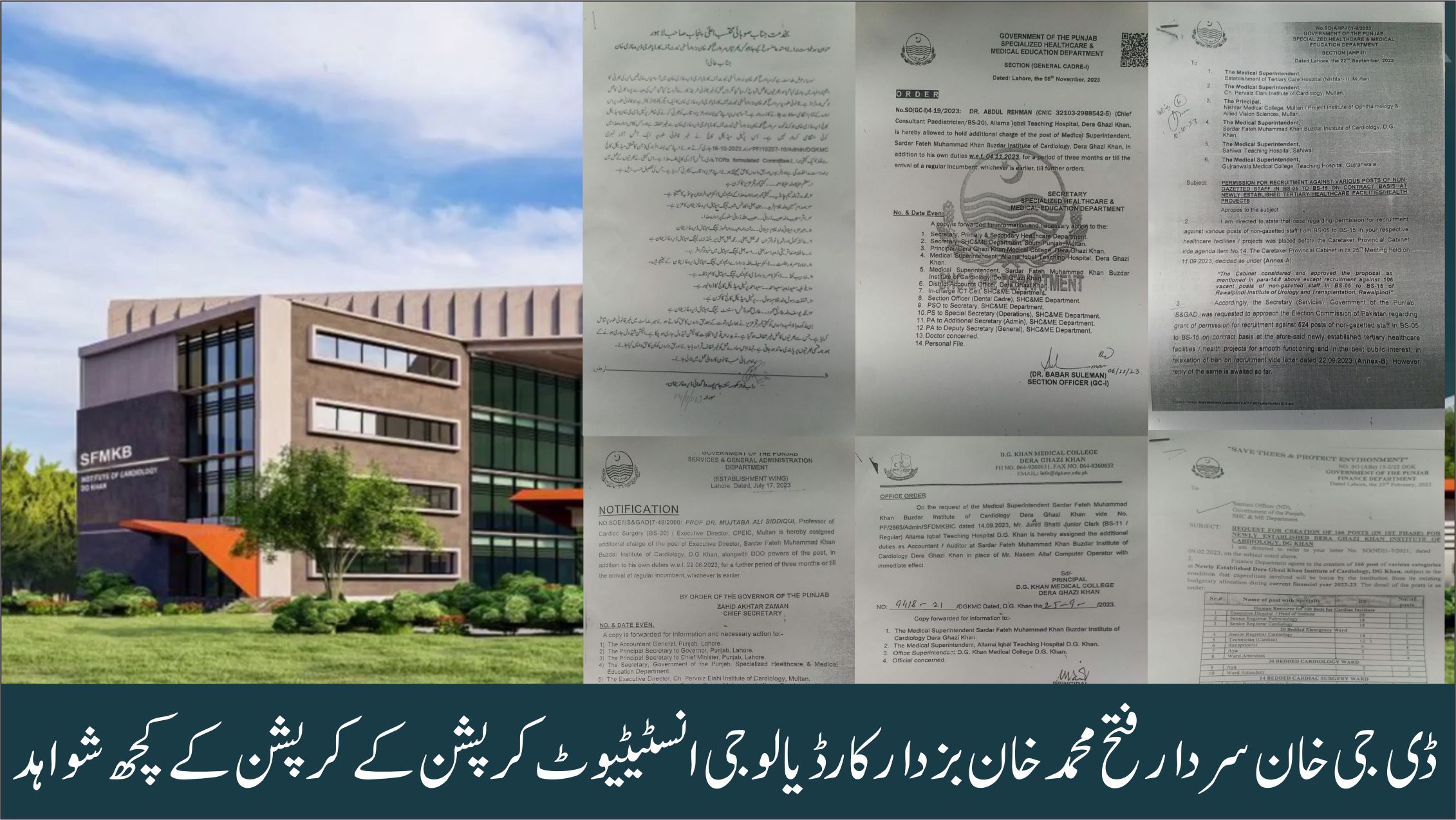 جب سردارسردارفتح محمدخان بزدارانسٹیٹیوٹ آف کارڈیویالوجی میں ہونے والی بھرتیوں سے متعلق ریسرچ کی تو ایک الگ سے رونگھٹے کھڑے کر دینے والی داستان سامان آگئی جس کی تفصیل کچھ اس طرح ہے کہ ایک نوٹیفکیشن نمبرNo.SOEII(S&GAD)7-48/2000مورخہ 17جولائی2023ء کوجاری ہوا،اس نوٹیفکیشن کے تحت ڈاکٹرمجتبیٰ علی صدیقی پروفیسرآف کارڈیک سرجری(BS20)کوڈیرہ غازیخان میں سردارفتح محمدخان بزدار انسٹی ٹیوٹ آف کارڈیالوجی میں ایگزیکٹوڈائریکٹرتعینات کیا گیااوراس سے قبل موصوف ملتان میں تعینات ہیں اور ڈیرہ غازیخان میں انہیں اضافی چارج دیاگیا ہے