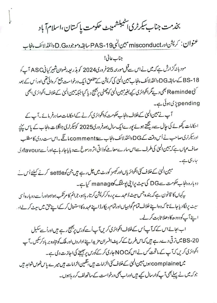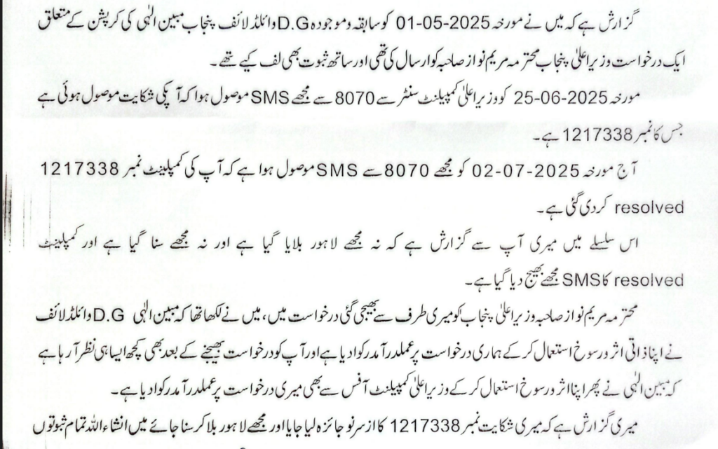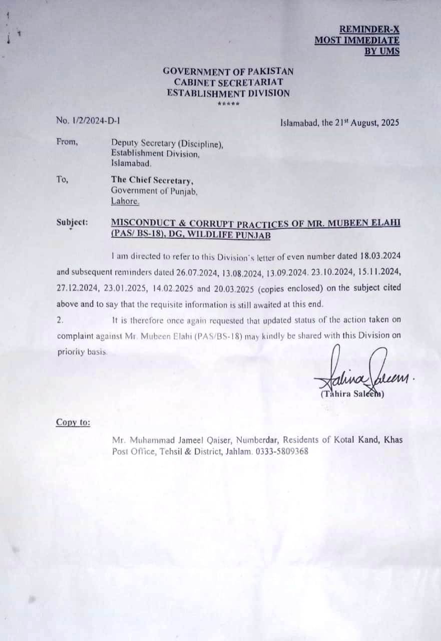 تفصیلات کے مطابق جہلم کے شہری اور مقامی سی بی او کے سیکرٹری جنرل راجہ محمد قیصر نمبردار نے وفاقی وزیر موسمیاتی تبدیلی مصدق ملک، اسٹیبلشمنٹ ڈویژن اور وزیراعلیٰ پنجاب کو مبینہ کرپشن کے شواہد ارسال کیے تھے۔ ان کا مؤقف ہے کہ گزشتہ دو برس سے مختلف فورمز پر دی گئی درخواستوں کے باوجود عملی کارروائی نہیں کی گئی۔راجہ محمد قیصر نمبردار کے مطابق انہوں نے 25 فروری 2024 کو اسٹیبلشمنٹ ڈویژن اور وفاقی وزیر کو ڈی جی وائلڈلائف مبین الٰہی کے خلاف انکوائری کے لیے تحریری درخواستیں دیں۔ اسی طرح وزیراعلیٰ پنجاب کے شکایات سیل کو بھی درخواست بھجوائی گئی، جو یکم مئی 2025 کو ارسال کی گئی۔ شکایات سیل کی جانب سے 25 جون کو درخواست وصول ہونے کی تصدیق کی گئی، تاہم 2 جولائی کو بغیر کسی وضاحت کے شکایت حل ہونے کا پیغام موصول ہوا۔ درخواست گزار کا کہنا ہے کہ اس دوران ان سے تفصیلات جاننے کے لیے کوئی رابطہ نہیں کیا گیا۔