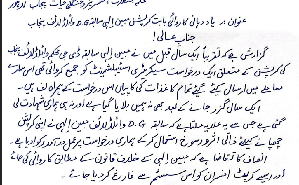 لاہور: ڈی جی وائلڈلائف پنجاب مبین الٰہی کے خلاف مبینہ کرپشن اور اختیارات کے ناجائز استعمال سے متعلق درخواستوں پر گزشتہ دو سال سے انکوائری نہ ہونے کا انکشاف ہوا ہے۔