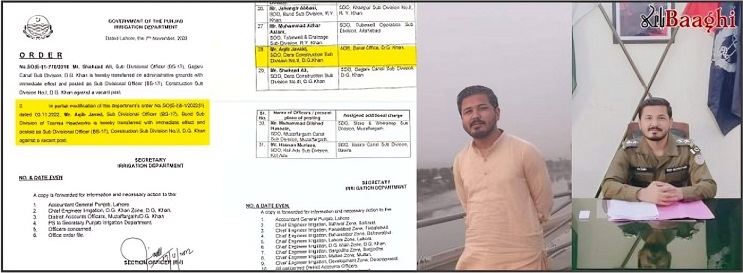 ڈیرہ غازی خان (باغی ٹی وی رپورٹ)محکمہ انہار میں افسران کی کمی یا کسی اور وجہ سے، ایک ہی افسر کو متعدد عہدوں کا چارج سونپے جانے کا معاملہ سامنے آیا ہے۔ اس حوالے سے ڈیرہ غازی خان میں ایک ایس ڈی او عاقب جاوید کا نام سامنے آ رہا ہے جو ایک وقت میں متعدد عہدوں کے مزے لوٹ رہا ہے۔