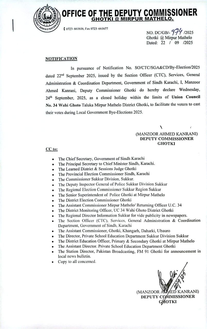 میرپور ماتھیلو (نامہ نگار باغی ٹی وی، مشتاق علی لغاری) ڈسٹرکٹ انفارمیشن آفس گھوٹکی کے مطابق 24 ستمبر 2025 بروز بدھ ضلع بھر میں عام تعطیل نہیں ہوگی۔ ڈپٹی کمشنر گھوٹکی کی جانب سے جاری نوٹیفکیشن میں واضح کیا گیا ہے کہ تعطیل صرف یونین کونسل واہی گھوٹو میں ہوگی۔