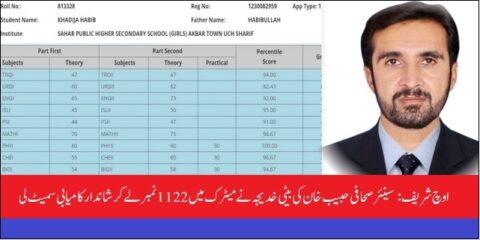 اوچ شریف (نامہ نگار) اوچ شریف کے سینئر صحافی اور پریس کلب کے جنرل سیکرٹری حبیب خان کی ہونہار بیٹی خدیجہ حبیب نے میٹرک کے سالانہ امتحانات 2025ء میں شاندار کامیابی حاصل کرتے ہوئے 1200 میں سے 1122 نمبر حاصل کر کے اپنے خاندان، اساتذہ اور ادارے کا نام روشن کر دیا۔