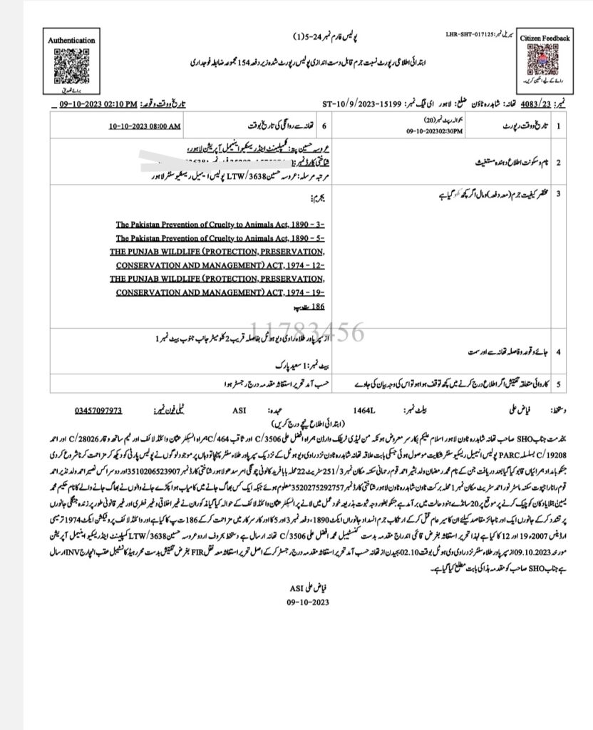 لاہور میں انسدادِ تشدد جانوراں ایکٹ 1890 کے تحت تیسری ایف آئی آر درج کر لی گئی،انچارج پولیس اینمل ریسکیو سینٹر لیڈی وارڈن عروسہ حسین کی مدعیت میں تھانہ شاہدرہ ٹاؤن میں مقدمہ درج، کیا گیا،شاہدرہ ٹاؤن میں یسین نامی ملزم نے حکیم خانہ بنارکھا تھا، شکایت پر حکیم خانہ کو چیک کرنے پر زندہ و مردہ جنگلی حیات پائے گئے، حکیم یسین جنگلی حیات پر ظلم و تشدد کرکے انہیں غیراخلاقی و غیر قانونی مقاصد کیلئے استعمال کرتا تھا، حکیم کی زندہ جنگلی حیات پر ظلم و تشدد، بے رحمی کی ویڈیوز سوشل میڈیا پر بھی موجود ہیں،