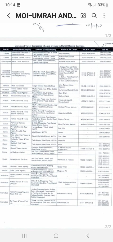 پاکستانی وزارت داخلہ نے متعدد عمرہ اور ٹریول کمپنیوں کے خلاف فیصلہ کن کارروائی کی ہے جو مبینہ طور پر غیر قانونی ہوالہ،ہنڈی کے کاروبار میں ملوث ہیں۔ یکم دسمبر 2023 کو ایک سرکاری میمورنڈم میں، وزارت نے متعلقہ حکام کو ان کمپنیوں کے خلاف سخت قانونی کارروائی شروع کرنے کی ہدایت کی ہے، جس سے ممکنہ طور پر ان کے مستقبل کے کاموں پر پابندی لگ سکتی ہے۔ میمورنڈم صورتحال کی سنگینی کو واضح کرتا ہے،اور اس بات پر روشنی ڈالتا ہے کہ یہ غیر قانونی مالیاتی سرگرمیاں کس طرح ملک کی ساکھ کو نقصان پہنچا رہی ہیں۔ ان کمپنیوں کی فہرست بھی سامنے آئی ہے جن کے حوالہ ہنڈی کے لین دین میں ملوث ہونے کا شبہ ہے، حکام پر زور دیا گیا ہے کہ وہ ایسی کمپنیوں کی رجسٹریشن منسوخ کریں اور سخت جرمانے عائد کریں۔