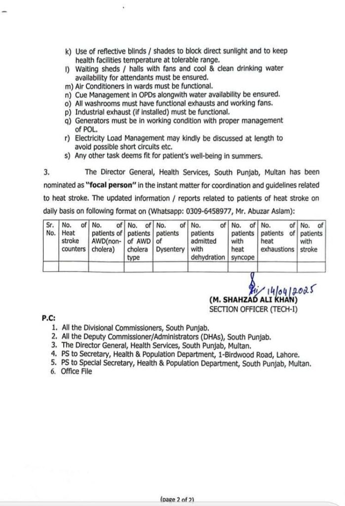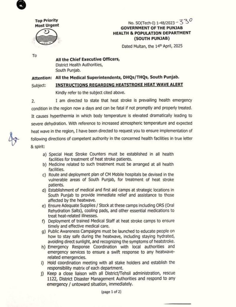 محکمہ صحت و آبادی جنوبی پنجاب کے سپیشل سیکریٹری محمد شہباز حسین کی جانب سے جنوبی پنجاب کے تمام ڈویژنل کمشنرز، ڈپٹی کمشنرز اور ضلعی ہیلتھ اتھارٹیز کو ایک باضابطہ مراسلہ بھیجا گیا ہے۔ اس مراسلے میں موجودہ موسمی صورتحال کو مدنظر رکھتے ہوئے فوری اور مؤثر اقدامات کرنے کی سخت ہدایت کی گئی ہے۔