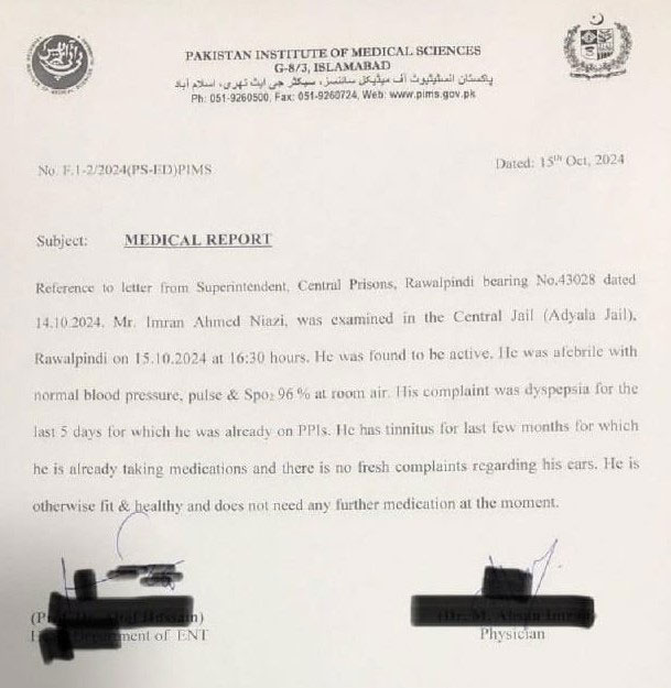 یہ طبی معائنہ اڈیالہ جیل کے سپرنٹنڈنٹ کی درخواست پر کیا گیا تھا، جس کا مقصد عمران خان کی صحت کی حالت کا جائزہ لینا تھا۔ طبی رپورٹ میں ان کی عمومی صحت کی تصدیق کرتے ہوئے یہ بات بھی واضح کی گئی ہے کہ انہیں کسی نئے علاج یا اضافی میڈیکیشن کی ضرورت نہیں ہے۔دوسری جانب، پی ٹی آئی نے شنگھائی تعاون تنظیم کے اجلاس کے موقع پر 15 اکتوبر کو ڈی چوک میں احتجاج کی کال دی تھی۔ پارٹی نے مؤقف اختیار کیا تھا کہ اگر عمران خان سے ملاقات کی اجازت دے دی جائے تو احتجاج کی کال واپس لے لی جائے گی۔ حکومت نے پی ٹی آئی کو یہ پیشکش کی تھی کہ وہ سرکاری ڈاکٹروں کی ایک ٹیم کے ذریعے عمران خان کا معائنہ کرا دے گی۔ پی ٹی آئی نے اس پیشکش کو قبول کرتے ہوئے اپنے احتجاج کو مؤخر کرنے کا فیصلہ کیا۔ یہ اقدام پی ٹی آئی کی جانب سے عمران خان کی صحت کے حوالے سے عوامی تشویش کے مدنظر لیا گیا، جبکہ ان کی صحت کی بحالی کے لئے جاری کوششوں کو بھی سامنے لاتا ہے۔