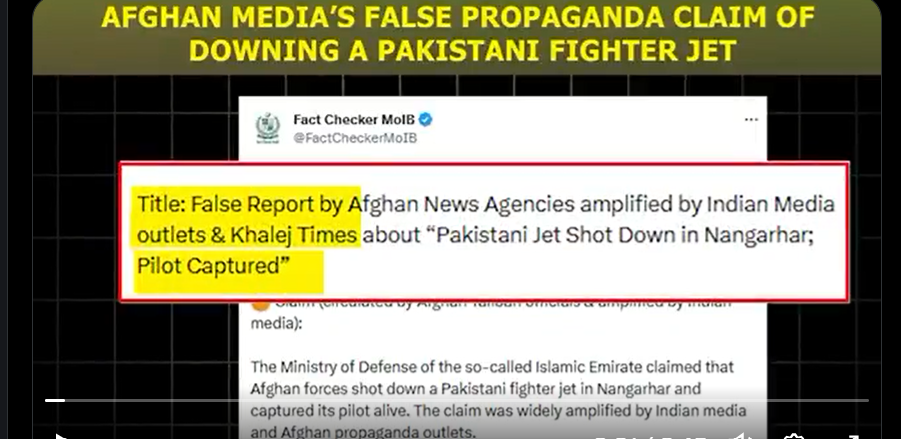 افغان طالبان رجیم کے آفیشل اکاؤنٹس سے پروپیگنڈا اور جھوٹے دعوے نشر کیے جانا ایک شرمناک عمل ہے، افغان وزارتِ دفاع نے من گھڑت دعویٰ کیا کہ افغان فورسز نے ننگرہار میں پاکستانی لڑاکا طیارہ مار گرایا اور پائلٹ کو زندہ گرفتار کر لیا،وزارتِ اطلاعات و نشریات پاکستان نے پاکستانی پائلٹ کی گرفتاری کا افغان اور بھارتی میڈیا کا جھوٹا پروپیگنڈا بے نقاب کر دیا،پاکستانی حکام، عالمی میڈیا اور دفاعی ادارے نے کسی طیارے کے نقصان کی تصدیق نہیں کی ، افغان حکام کا بے بنیاد دعویٰ بھارتی میڈیا اور افغان پروپیگنڈا ذرائع نے بڑے پیمانے پر پھیلایا گیا ، افغانستان کی جانب سے جاری کردہ تصویر 2021 میں ترکی میں روسی جہاز کے حادثے کی ہے، زمینی حقائق نہ ہونے کے باعث بھارت اور افغان مضحکہ خیز دعوؤں کو محض فریب اور ہزیمت قرار دیا جارہا ہے