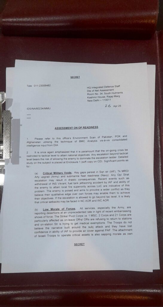 انٹیگریٹڈ ڈیفنس اسٹاف (آئی ڈی ایس) کی جانب سے تیار کردہ ایک انتہائی خفیہ رپورٹ میں بھارتی دفاعی نظام میں موجود سنگین خامیوں اور آپریشنل تیاری کے حوالے سے تشویشناک انکشافات کیے گئے ہیں۔ 26 اپریل 2025 کی اس رپورٹ میں پاکستان، آزاد کشمیر اور افغانستان کی صورتحال کا تفصیلی تجزیہ پیش کیا گیا ہے، جس میں انٹیلی جنس ڈائریکٹوریٹ (ڈی آئی اے) سے حاصل کردہ معلومات کو بھی شامل کیا گیا ہے۔رپورٹ میں زور دیا گیا ہے کہ موجودہ بحرانی صورتحال کو قومی مقاصد کے حصول کے لیے صرف ٹیکٹیکل سطح تک محدود رکھنا انتہائی ضروری ہے۔ tactical سطح سے کسی بھی قسم کی پیش قدمی دشمن کو صورتحال پر حاوی ہونے کا موقع فراہم کر سکتی ہے۔