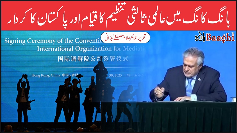30 مئی 2025 کو پاکستان نے ہانگ کانگ میں قائم ہونے والی عالمی ثالثی تنظیم (International Organization for Mediation – IOMed) کے کنونشن پر دستخط کیے۔ یہ اقدام عالمی تنازعات کے پرامن حل کے لیے پاکستان کے عزم کو ظاہر کرتا ہے۔ نائب وزیر اعظم اور وزیر خارجہ سینیٹر محمد اسحاق ڈار نے اس تقریب میں پاکستان کی نمائندگی کی اور چین کے اس اقدام کی حمایت کرتے ہوئے عالمی تنازعات کے پرامن حل کی اہمیت پر زور دیا۔ انہوں نے خاص طور پر بھارت کی جانب سے سندھ طاس معاہدے کی خلاف ورزیوں اور جموں و کشمیر کے تنازع کو اجاگر کیا۔ ان کا کہنا تھا کہ بھارت کی حالیہ فوجی جارحیت اور بین الاقوامی قوانین کی خلاف ورزیاں علاقائی اور عالمی امن کے لیے سنگین خطرہ ہیں۔ انہوں نے اقوام متحدہ کی سلامتی کونسل کی قراردادوں اور کشمیری عوام کی امنگوں کے مطابق جموں و کشمیر تنازع کے حل کی ضرورت پر زور دیا۔