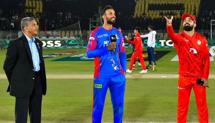 ایچ بی ایل پاکستان سپر لیگ( پی ایس ایل) سیزن 9 کے 24 ویں میچ میں اسلام آباد یونائیٹڈ نے کراچی کنگز کے خلاف ٹاس جیت کر فیلڈنگ کا فیصلہ کیا ہے۔پنڈی اسٹیڈیم میں کھیلے جارہے میچ میں اسلام آباد یونائیٹڈ کے کپتان شاداب خان نے ٹاس جیت کر کراچی کنگز کو پہلے بیٹنگ کی دعوت دے دی۔اسلام آباد یونائیٹڈ کی ٹیم میں 2 تبدیلیاں کی گئی ہیں جبکہ کراچی کنگز نے آج کے میچ کے لیے اپنی ٹیم میں کوئی تبدیلی نہیں کی۔ٹاس کے بعد گفتگو کرتے ہوئے شاداب خان کا کہنا تھا کہ اسلام آباد یونائیٹڈ میں 3تبدیلیاں کی گئی ہیں ، پچ اچھی لگ رہی ہے موسم بھی کافی بہتر ہے ، گزستہ روز بھی بچ اچھی تھی لیکن ہم برا کھیلے ، آج کا میچ دونوں ٹیموں کے لیے اہم ہے ،نسیم شاہ ، رومان رئیس اور جارڈن کاکس کو آرام دیا گیا ہے ،میتھیو فورڈ ، حیدر علی اور ٹائمل ملز کو ان کی جگہ اسلام آباد یونائیٹیڈ میں شامل کیا گیا ہے ۔