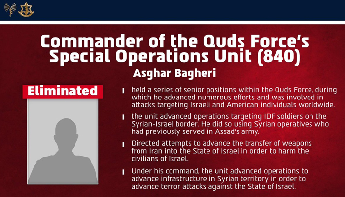 اسرائیلی فوج نے دعویٰ کیا ہے کہ اس نے تہران میں ایک فضائی حملے کے دوران ایران کی قدس فورس کے اسپیشل آپریشنز یونٹ کے کمانڈر اصغر باقری کو شہید کر دیا ہے۔