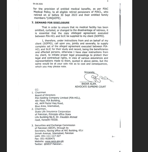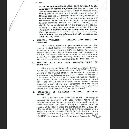 نوٹس میں بتایا گیا ہے کہ بعد ازاں پی آئی اے کو دو اداروں، یعنی PIACL اور PIA-HCL میں تقسیم کیا گیا۔ سیکیورٹیز اینڈ ایکسچینج کمیشن آف پاکستان (SECP) نے 3 مئی 2024 کو اسکیم آف ارینجمنٹ (SOA) کی منظوری دی، جس کے تحت ریٹائرڈ ملازمین کی پنشن اور طبی سہولیات سمیت تمام واجبات پی آئی اے ہولڈنگ کمپنی کو منتقل کر دیے گئے۔ایس ای سی پی کے حکم نامے کے پیرا 9 کا حوالہ دیتے ہوئے کہا گیا ہے کہ کمیشن نے توقع ظاہر کی تھی کہ کمپنی ریٹائرڈ ملازمین کے خدشات کو قانون کے مطابق دور کرے گی اور ان کے حقوق متاثر نہیں ہوں گے۔نوٹس میں انکشاف کیا گیا ہے کہ یکم اکتوبر 2025 کو پی آئی اے ہولڈنگ کمپنی کے بورڈ کی ذیلی کمیٹی برائے طبی سہولیات کے اجلاس میں اسٹیٹ لائف انشورنس کارپوریشن نے مجوزہ میڈیکل انشورنس پلان پر بریفنگ دی تھی۔ اس موقع پر ریٹائرڈ افسران کی تنظیم نے کئی تحفظات کا اظہار کیا اور معاہدے کا مسودہ فراہم کرنے کی درخواست کی، جس پر کمیٹی نے رضامندی ظاہر کی تھی۔تاہم تنظیم کے مطابق تین تحریری یاد دہانیوں کے باوجود معاہدے کا مسودہ فراہم نہیں کیا گیا۔