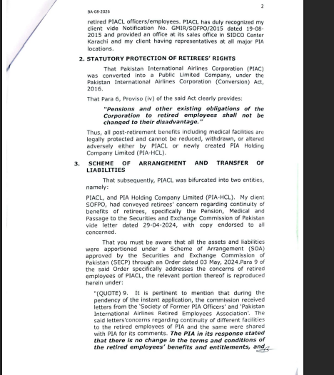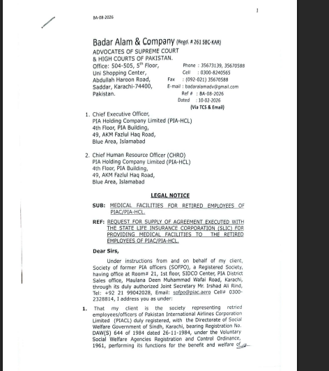 قانونی نوٹس 10 فروری 2026 کو جاری کیا گیا جس میں چیف ایگزیکٹو آفیسر اور چیف ہیومن ریسورس آفیسر پی آئی اے ہولڈنگ کمپنی کو مخاطب کرتے ہوئے مطالبہ کیا گیا ہے کہ اسٹیٹ لائف انشورنس کارپوریشن کے ساتھ کیے گئے معاہدے کی مکمل نقل فوری طور پر فراہم کی جائے۔نوٹس میں مؤقف اختیار کیا گیا ہے کہ پاکستان انٹرنیشنل ایئرلائنز کارپوریشن (PIAC) کو 2016 کے ایکٹ کے تحت پبلک لمیٹڈ کمپنی میں تبدیل کیا گیا تھا، جس کے پیرا 6 کی شق (iv) میں واضح طور پر درج ہے کہ ریٹائرڈ ملازمین کی پنشن اور دیگر مراعات کو ان کے نقصان میں تبدیل نہیں کیا جا سکتا۔وکیل کے مطابق طبی سہولیات بھی بعد از ریٹائرمنٹ مراعات کا حصہ ہیں، لہٰذا انہیں کم یا ختم کرنا قانوناً ممکن نہیں۔