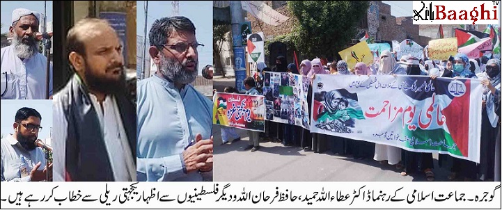 تفصیل کے مطابق نہتے فلسطینیوں پر جاری اسرائیلی ظلم و بربریت پر مسلم امہ کی خاموشی اور بے حسی کو شرمناک فعل قرار دیتے ہوئے جماعت اسلامی حلقہ خواتین گوجرہ کے زیر اہتمام مسجد شہداء جھنگ روڈ سے ایک احتجاجی ریلی نکالی گئی۔ ریلی سے خطاب کرتے ہوئے جماعت اسلامی کے رہنما ڈاکٹر عطاء اللہ حمید، حافظ فرحان اللہ ضلعی امیر، مولانا رحمت اللہ ارشد، ضلعی نائب امیر، حیدر علی چوہدری، قاری محمد آصف اور حافظ واجد نے کہا کہ بے گناہ فلسطینیوں کا خون بہایا جا رہا ہے اور عالم اسلام کو متحد ہو کر اسرائیلی جارحیت کا منہ توڑ جواب دینا چاہئے۔