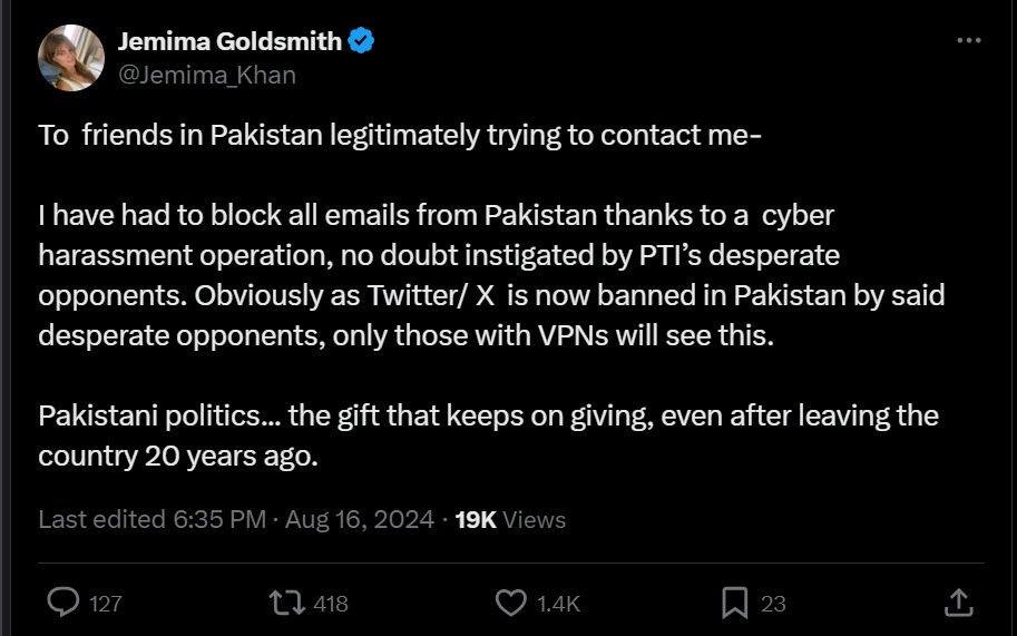 پاکستان تحریک انصاف (پی ٹی آئی) کے بانی عمران خان کی سابق اہلیہ، جمائمہ گولڈ اسمتھ نے حالیہ ٹویٹ میں پاکستان سے آنے والی تمام ای میلز کو بلاک کرنے کا اعلان کیا ہے۔ ان کے مطابق، یہ اقدام ایک سائبر ہراسمنٹ مہم کے نتیجے میں اٹھایا گیا ہے، جو مبینہ طور پر پی ٹی آئی کے مخالفین کی جانب سے چلائی گئی ہے۔جمائمہ گولڈ اسمتھ نے 16 اگست 2024 کو اپنے ایکس (ٹوئٹر) اکاؤنٹ پر لکھا کہ انہیں یہ قدم اُٹھانا پڑا کیوں کہ وہ پاکستان سے ملنے والے ہراسمنٹ کا سامنا کر رہی تھیں۔ انہوں نے کہا کہ یہ مہم پی ٹی آئی کے مایوس مخالفین کی طرف سے اُکسانے کے بعد شروع کی گئی۔