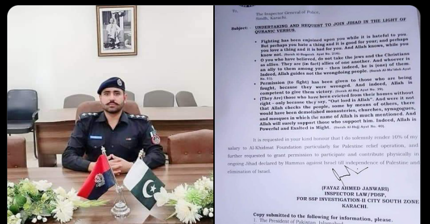 پاکستان کے صوبہ سندھ کی پولیس میں تعینات انسپکٹر نے حماس کی جانب سے اسرائیل کے خلاف اعلان جہاد میں حصہ لینے کے لئے آئی جی سندھ کو خط لکھ کر اجازت مانگ لی،ایس ایس پی انویسٹی گیشن ٹو سٹی ساؤتھ زون میں تعینات انسپکٹرفیاض احمد جانوری نے آئی جی سندھ کو ایک خط لکھا ہے جس میں انسپکٹر فیاض احمد جانوری نے جہاد میں جسمانی طور پر اپنا حصہ جہاد میں ڈالنے کے لیے آئی جی سندھ نے باضابطہ اجازت مانگی ہے