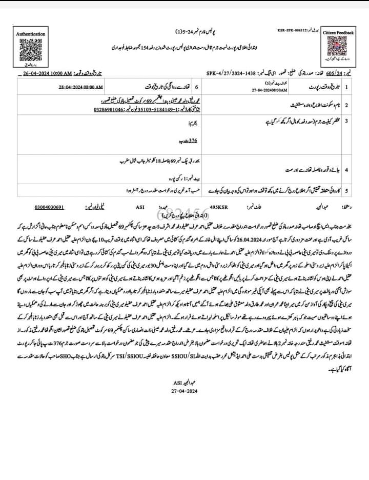 چک 69 پتوکی کے رہائشی محمد رفیق کی جواں سالہ لڑکی عاصمہ بی بی کو ملزم عقیل نے جبری زیادتی کا نشانہ بنایا تھا