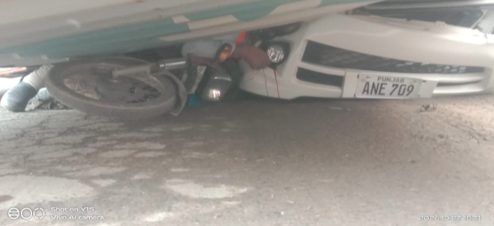 کے نیچے ایک موٹر سائیکل اور ایک کار آگئی