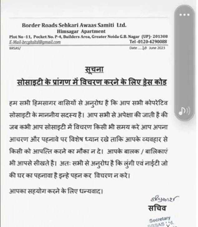 رہائشی کالونی میں لنگی اور خواتین کے لئے نائٹ ڈریس پہن کر گھر سے باہر نکلنے پر پابندی لگا دی گئی ہے