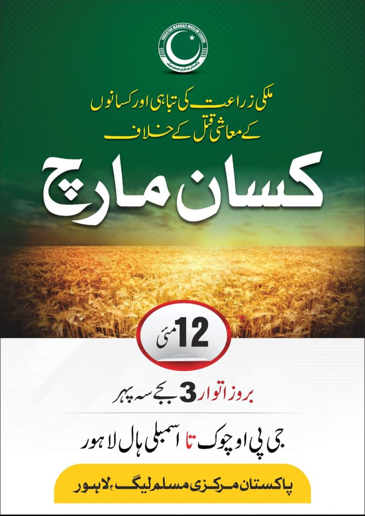 کسان مارچ دوپہر 3 بجے جی پی او چوک لاہور سے شروع ہو گا اور پنجاب اسمبلی ہال پہ اختتام پذیر ہو گا جس میں مرکزی مسلم لیگ پاکستان کے راہنما و ملک بھر سے کسان راہنما خطاب فرمائیں گے اور کسانوں کے حقوق کے لئے آواز بلند کرینگے