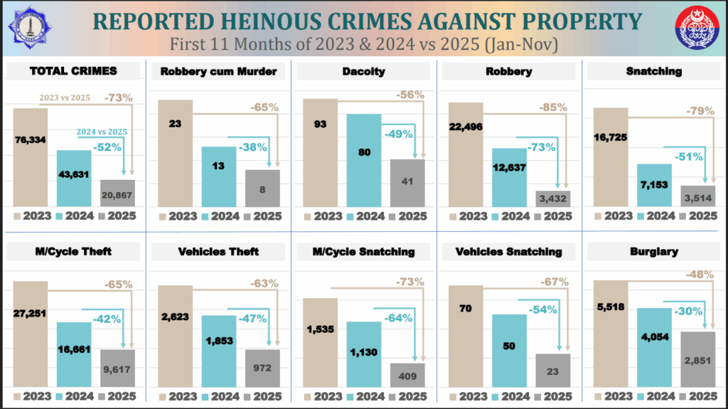 جرائم کی مختلف اقسام میں نمایاں کمی دیکھنے میں آئی، ڈکیتی کے دوران قتل 2023 میں 23 واقعات ہوئے،2024 میں 13 واقعات ہوئے،2025 میں 8 واقعات ہوئے، 2023 کے مقابلے میں 65٪ کمی، 2024 کے مقابلے میں 38٪ کمی دیکھنے میں آئی، ڈکیتی کی 2023 میں 93وارداتیں،2024 میں 80وارداتیں،2025 میں اب تک 41وارداتیں ہوئیً، دو سال میں مجموعی طور پر 56٪ کمی دیکھنے میں آئی، رابری کے2023 میں 22,496واقعات،2024 میں 12,637 واقعات،2025 میں 3,432واقعات ہوئے، گزشتہ دو برسوں میں حیران کن 85٪ کمی دیکھنے کو ملی، اسنیچنگ ،چھینا جھپٹی کے 2023 میں 16,725واقعات،2024 میں7,153واقعات اور 2025 میں 3,514 واقعات پیش آئے، 2023 کے مقابلے میں 79٪ کمی دیکھنے میں آئی،گاڑیاں اور موٹر سائیکلوں کی چوری و چھیننے کی وارداتوں میں بھی کمی ہوئی، موٹر سائیکل چوری کے 2023 میں 27,251 واقعات،2024 میں 16,681واقعات،2025 میں 9,617واقعات پیش آئے، دو برس میں 65٪ کمی دیکھنے کو ملی، گاڑیاں چوری کے 2023 میں 2,623واقعات،2024 میں 1,853واقعات،2025 میں 972واقعات پیش آئے، 2023 کے مقابلے میں 63٪ کمی دیکھنے کو ملی،موٹر سائیکل اسنیچنگ کے 2023 میں1,535کیسز،2024 میں 1,130کیسز، اور 2025 میں 409مقدمات درج ہوئے، 73٪ نمایاں کمی دیکھنے میں آئی، گاڑیوں کی اسنیچنگ کے 2023 میں 70 واقعات،2024 میں 50واقعات،2025 میں23واقعات پیش آئے، دو سال میں 67٪ کمی ہوئی، چوری،ڈکیتی کے 2023 میں5,518واقعات،2024 میں4,054واقعات،2025 میں 2,851واقعات پیش آئے،اور 48٪ کمی دیکھنے کو ملی،