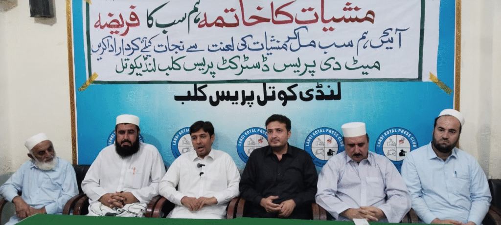 لنڈی کوتل (باغی ٹی وی،تحصیل رپورٹر)ڈسٹرکٹ خیبر پریس کلب لنڈی کوتل (رجسٹرڈ) میں "منشیات کا خاتمہ، ہم سب کا فریضہ” کے عنوان سے ایک اہم میٹ دی پریس سیشن کا انعقاد کیا گیا جس میں سیاسی و سماجی رہنما، علما کرام، پولیس افسران اور انتظامیہ کے نمائندوں نے شرکت کی۔ شرکاء نے نوجوان نسل کو نشے کی لت سے بچانے اور منشیات فروشوں کے خلاف مربوط حکمت عملی کی ضرورت پر زور دیا۔