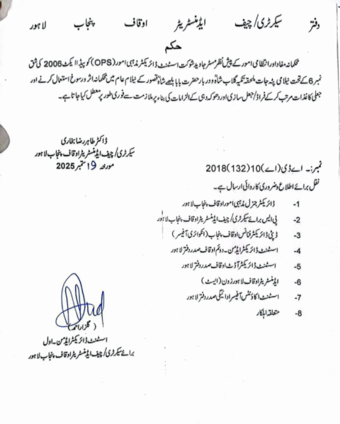 محکمہ اوقاف نے اسسٹنٹ ڈائریکٹر مذہبی امور جاوید شوکت کو محکمانہ اثرورسوخ کا غلط استعمال کرنے اور جعلی کاغذات،دھوکہ دہی کرنے پر معطل کر دیا