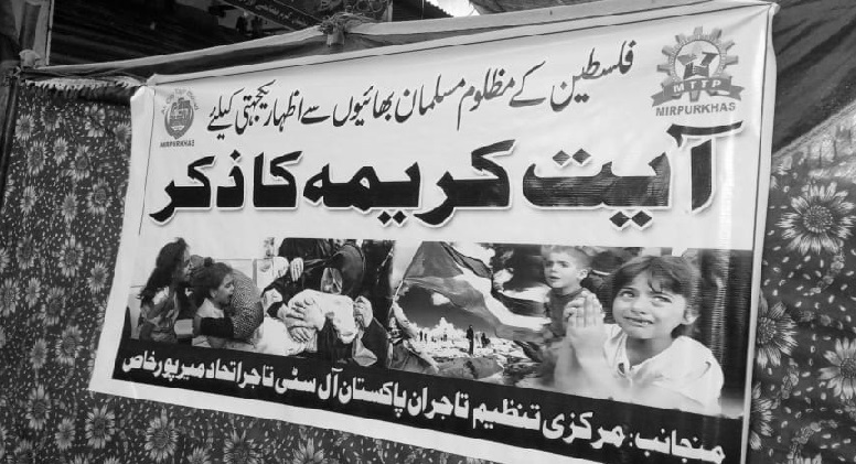 میرپور خاص،باغی ٹی وی (نامہ نگار سید شاہزیب شاہ کی رپورٹ )مرکزی تنظیم تاجران پاکستان آل سٹی تاجر اتحاد میرپورخاص کی جانب سے فلسطین کے مظلوم مسلمان بھائیوں سے اظہار یکجہتی کیلیے آیت کریمہ کا ذکر شاہی بازار گردوارہ گلی میں کروایا گیا جس میں سیاسی جماعتوں مذہبی مدارس کے طلباء اور کاروباری حضرات نے شرکت کی