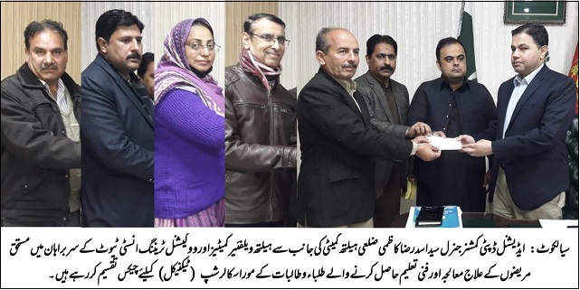 سیالکوٹ ، باغی ٹی وی (سٹی رپورٹر شاہد ریاض) ایڈیشنل ڈپٹی کمشنر جنرل سید اسد رضا کاظمی ،ضلعی زکوٰۃ کمیٹی سیالکوٹ کی جانب سے مستحق مریضوں کے علاج معالجہ کیلئے تحصیل ہیڈکوارٹر ہسپتالوں ڈسکہ، پسرور اور سمبڑیال کو مجموعی طور پر 24لاکھ 85ہزار روپے کے چیکس اور 3ووکیشنل ٹریننگ انسٹیٹیوٹ کو مجموعی طور پر 96لاکھ4ہزار روپے کے چیکس مستحق طلباء و طالبات کو فنی تعلیم کیلئے مورا سکالرز شپ (ٹیکنیکل)کی پہلی قسط سال 2023اور 2024 کے چیکس اداروں کے سربراہان میں تقسیم کردیئے۔